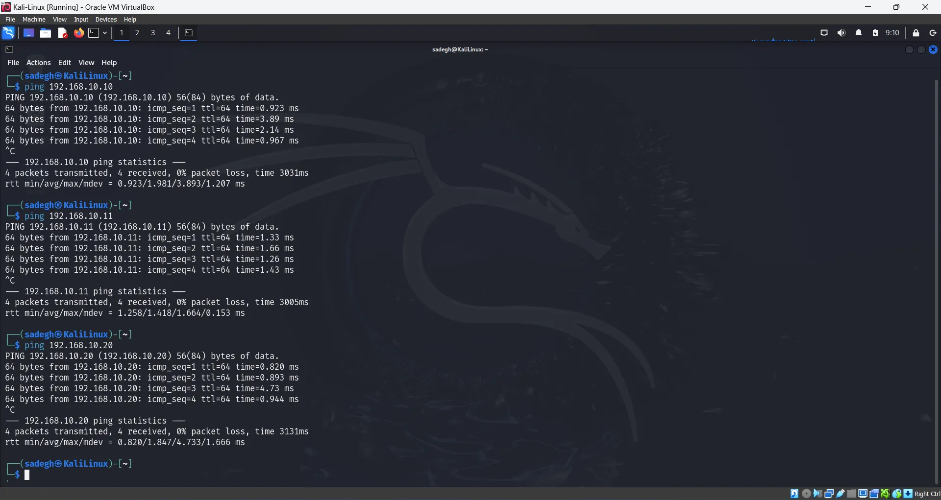 ابتدا تمامی ماشین مجازی ها را اجرا کنید. سپس در محیط Kali چک میکنیم که پینگ OSSIM-Server, OSSIM-Sensor و Webserver را داشته باشیم: