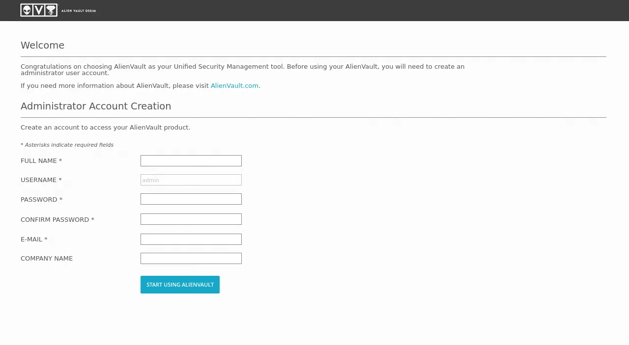 نام، پسورد و ایمیل دلخواه را وارد کنید و Start Using AlienVault را بزنید.