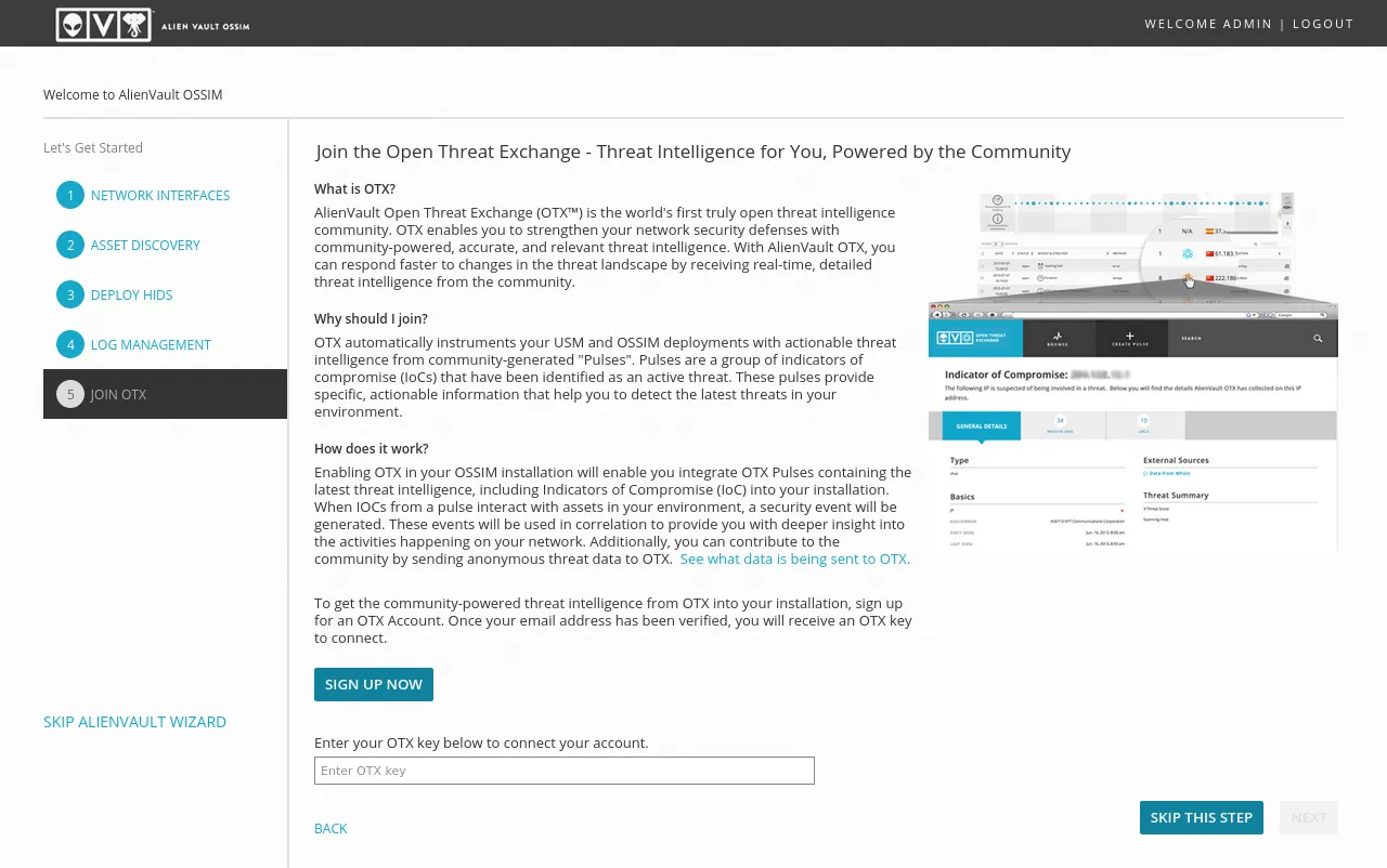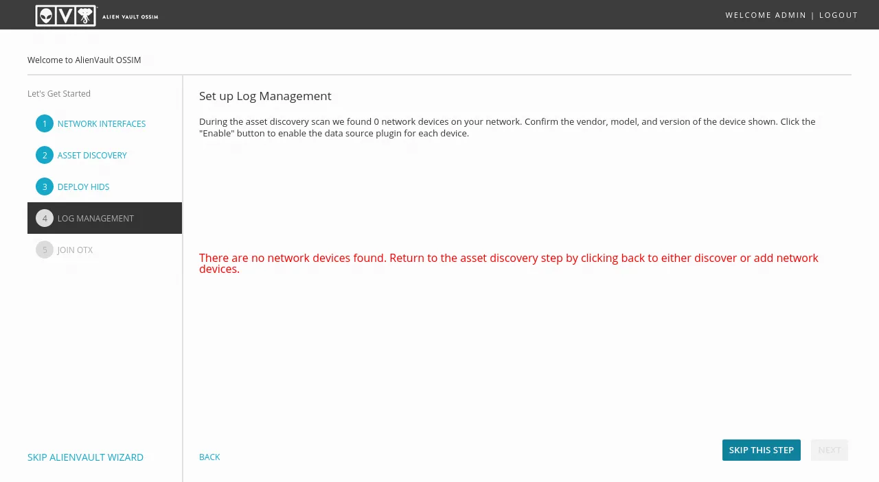 OTX مخفف Open Threat Exchange یک سرویس Threat Intelligence است که اطلاعات تهدیدات و آسیب پذیری ها را به ما ارائه میدهد. از آن جایی که ما در این جا اینترنت نداریم، از این مرحله رد میشویم اما در یک سناریو واقعی، استفاده از این سرویس امری حیاتیست. Skip This Step و سپس Finish را بزنید تا پیکربندی OSSIM SIEM به پایان برسد. Explore AlienVault OSSIM را بزنید تا وارد داشبرد OSSIM شوید.