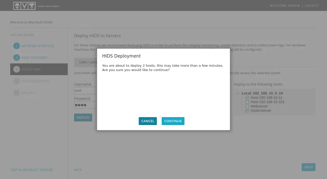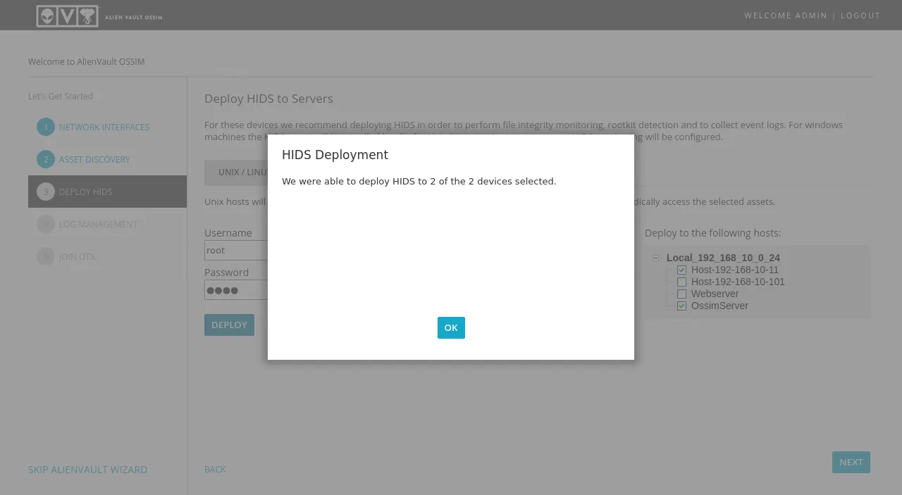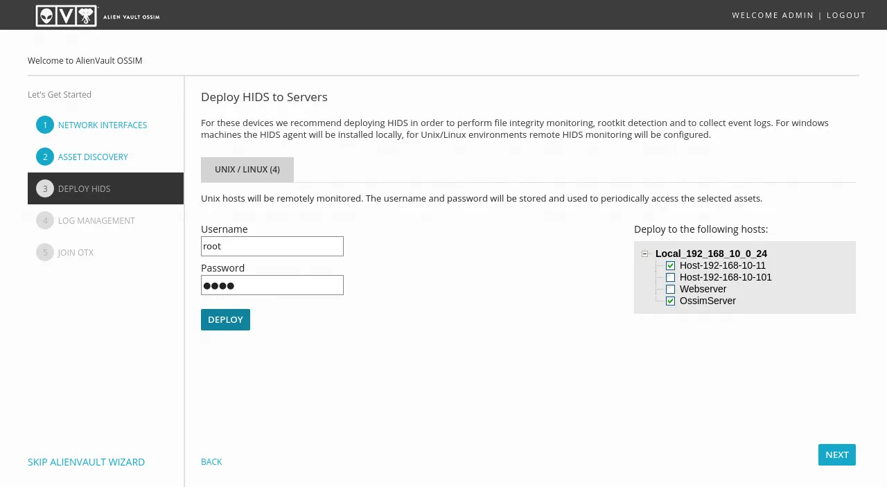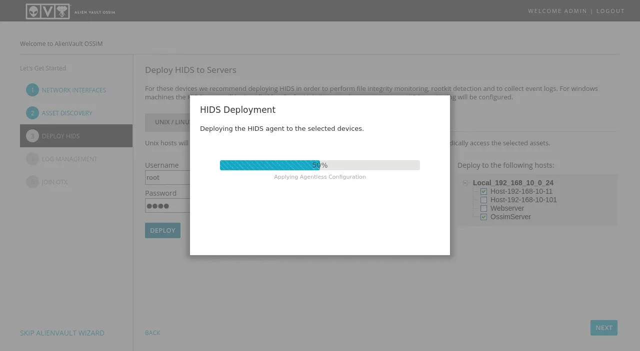 در این قسمت HIDS را بر روی OSSIM Server، OSSIM Sensor و Webserver راه اندازی میکنیم. از آن جایی که یوزر و پسورد OSSIM Server و OSSIM Sensor با Webserver متفاوت است، ابتدا HIDS را بر روی OSSIM Server و OSSIM Sensor راه اندازی میکنیم. برای این کار از سمت راست OSSIM Server و OSSIM Sensor را انتخاب کنید و یوزر (root) و پسورد Server و Sensor را وارد کنید.